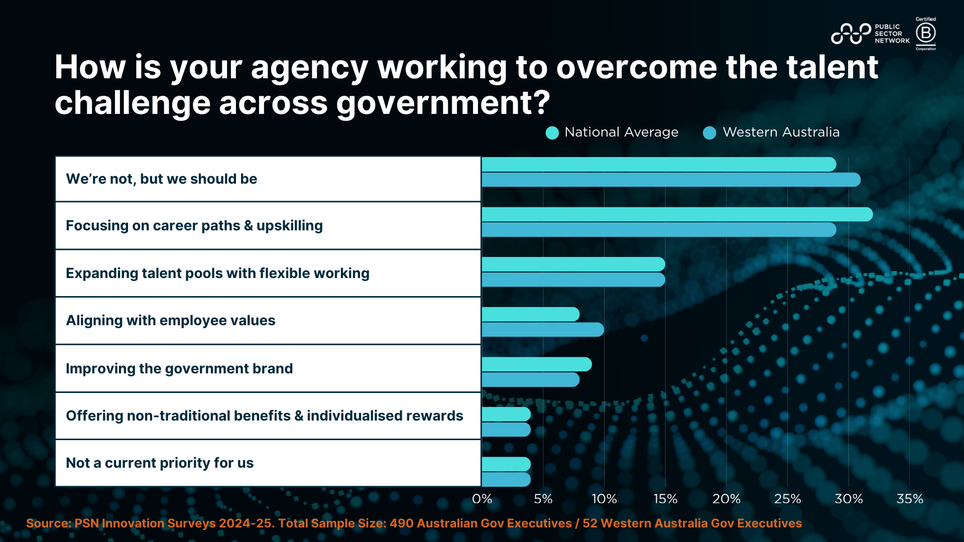 WA respondents also placed somewhat greater importance on aligning with employee values (10% versus 8% nationally), indicating recognition that cultural and generational expectations are increasingly shaping workforce engagement. Meanwhile, efforts to improve the government brand (8%), expand talent pools through flexible working (15%), and offer non-traditional benefits (4%) were consistent with national figures, highlighting broad alignment in secondary strategies across jurisdictions.