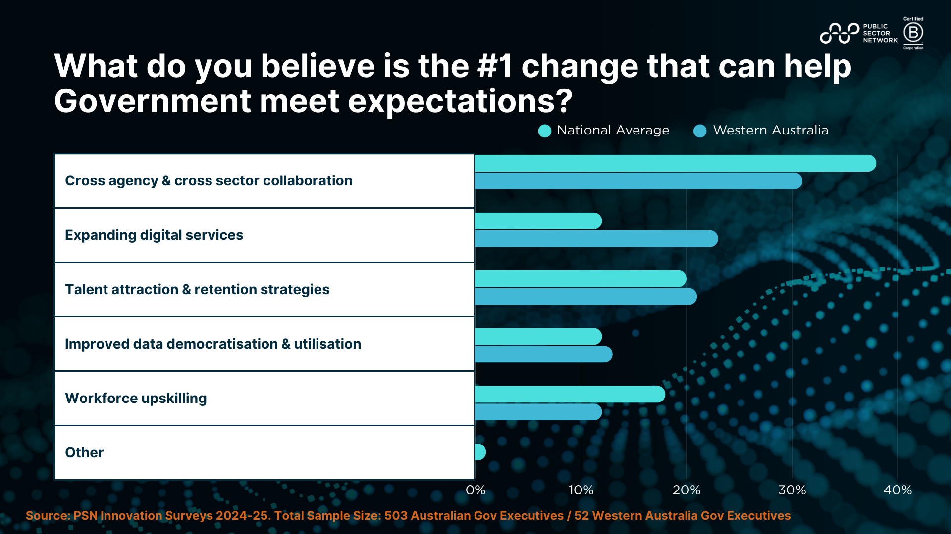 Cross-agency and cross-sector collaboration remained the top choice nationally (38%), but was weighted lower in WA (31%). While still seen as important, this suggests WA may be more focused on accelerating digital service delivery than on systemic partnership approaches, potentially limiting opportunities to address challenges that span departmental and jurisdictional boundaries.