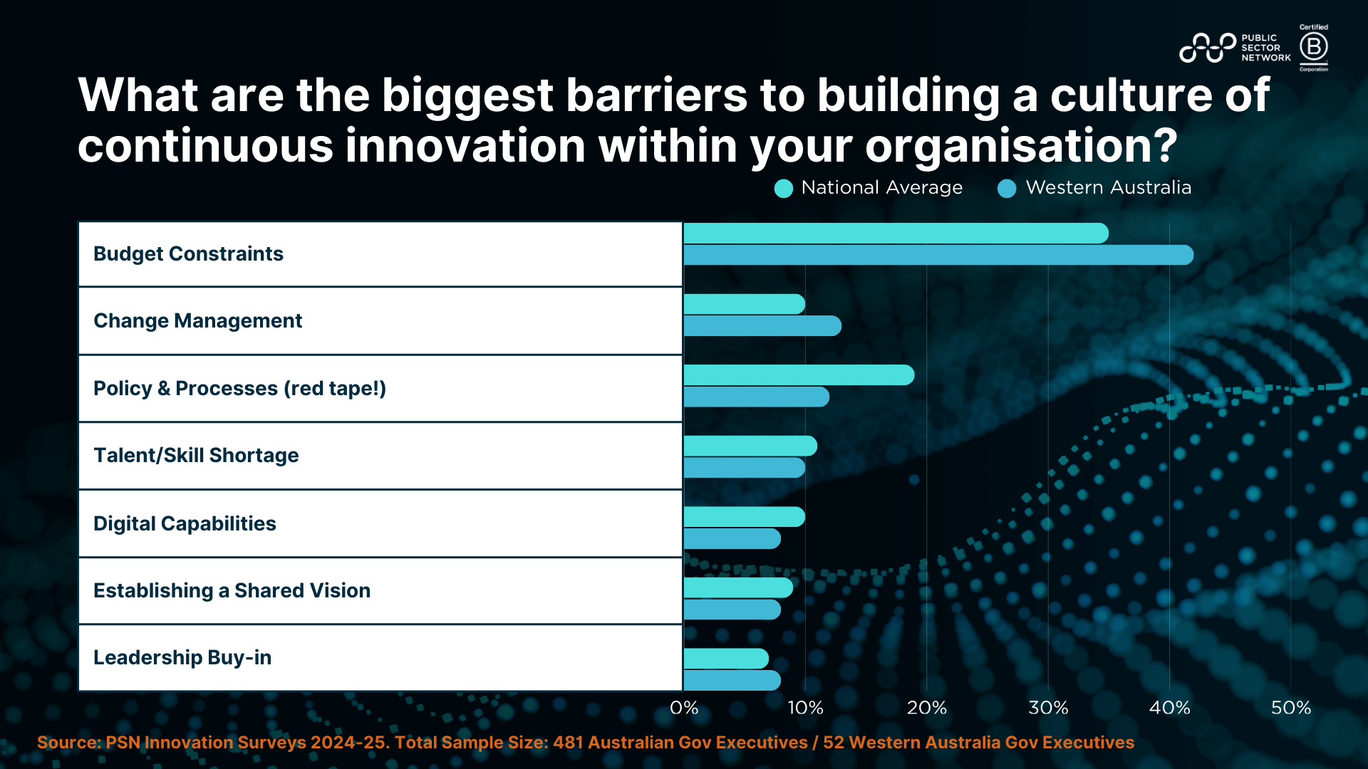 Budget constraints emerged as the most significant barrier for the Western Australian Government in building a culture of continuous innovation, cited by 42% of respondents compared with 35% nationally. This stronger weighting highlights a pronounced concern within WA about the adequacy of resources to fund innovation, signalling that financial pressures may be constraining the scale and speed of digital transformation initiatives.