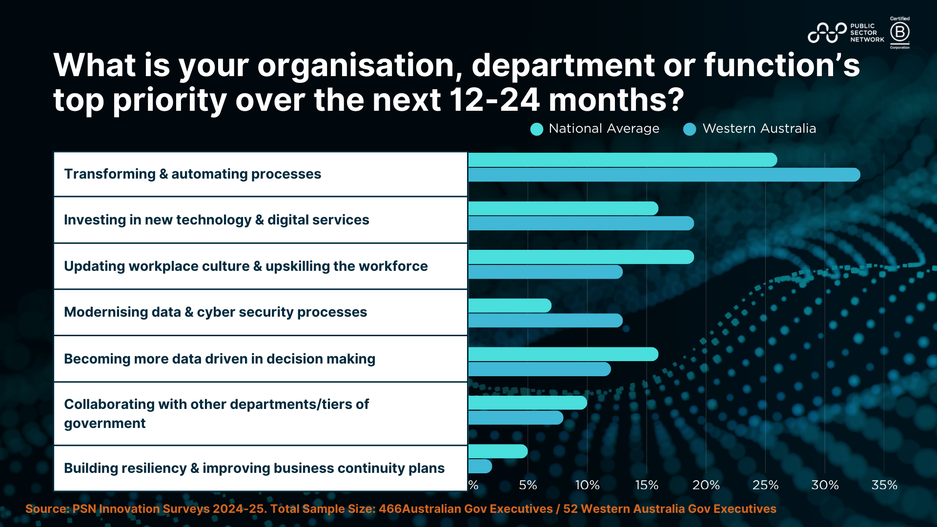One of the most striking differences in the results lies in the modernisation of data and cyber security processes. WA placed a significantly higher priority here (13%) than the national average (7%). This points to a heightened regional focus on securing digital foundations, strengthening trust in government systems, and building resilience against rising cyber threats — a trend consistent with global digital government priorities.