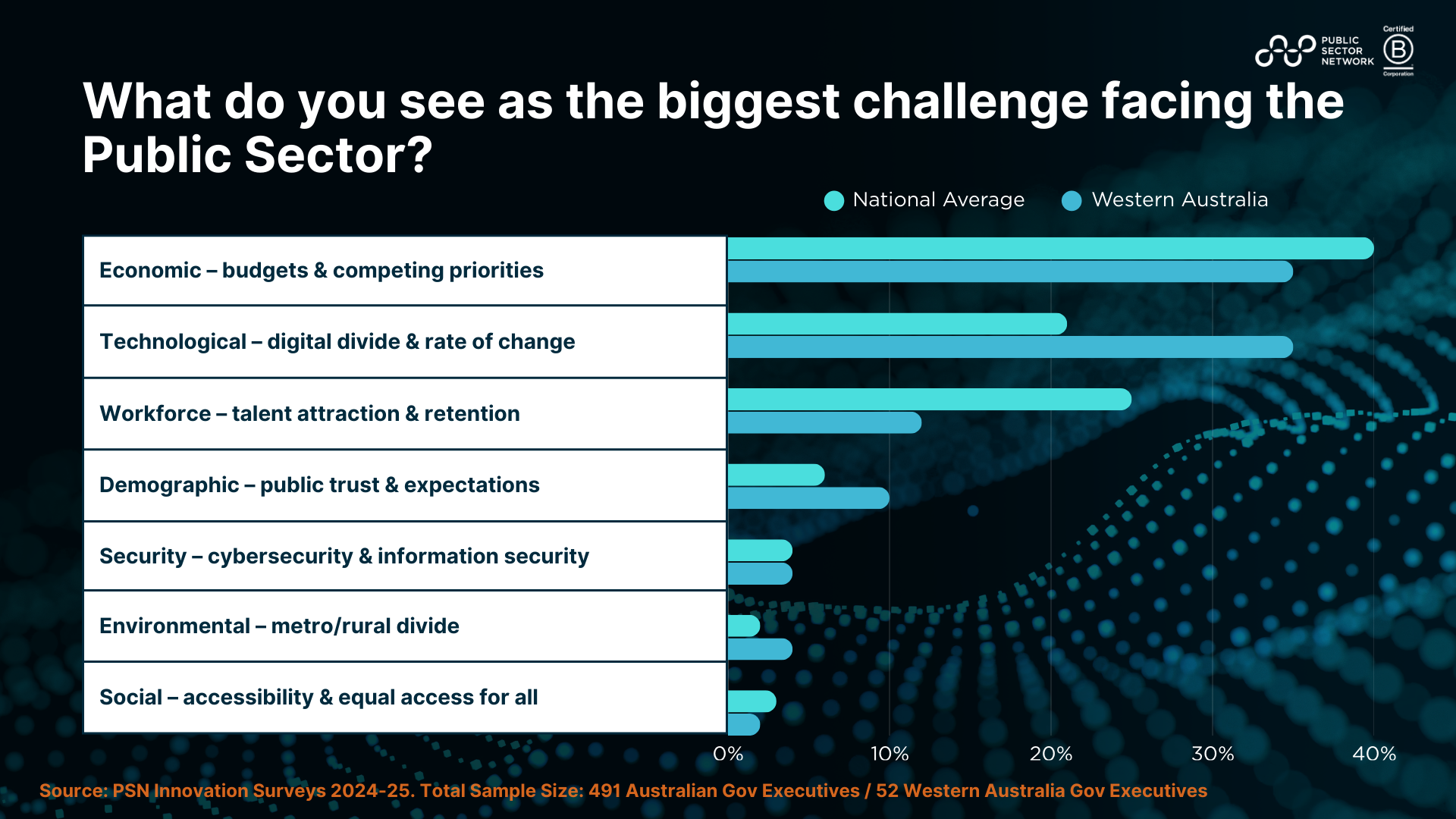 Western Australian respondents identified technological challenges — particularly the digital divide and the rapid rate of change — as their most pressing issue (35%), far surpassing the national average (21%). This points to a strong regional recognition of the disruptive pace of technological evolution and the critical importance of bridging access and capability gaps to ensure equitable and effective public service delivery.
