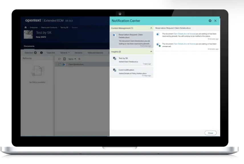 Initially introduced in CE 21.3, Notification Center continues to evolve as the collaboration hub in Extended ECM. This release has added e-mail as a delivery channel for all Notification Center updates. This means that users can enable e-mail delivery of messages sent to them through Notification Center, promptly receiving changes to their watched Business Workspaces, Content Syndication operations and more.