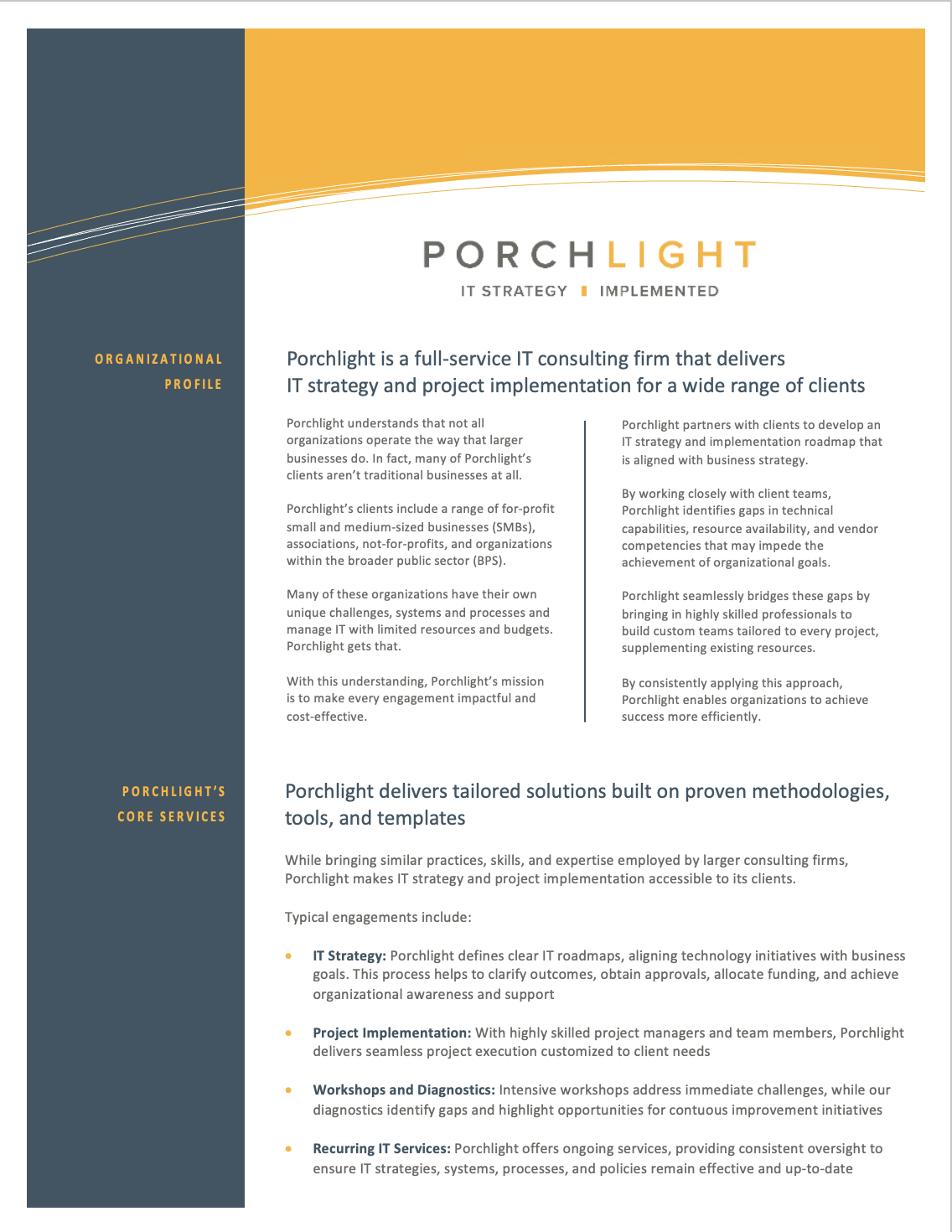 Porchlight is a full-service IT consulting firm that delivers IT strategy and project implementation to small businesses, associations, not-for-profits, and organizations the broader public sector BPS