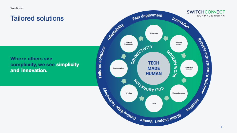 We provide services in connectivity, modern work, and collaboration, including communication solutions, software development, Hybrid Edge, AI & data, and Managed Services—all under the vision: Tech made human.