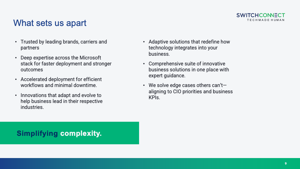 Switch Connect delivers voice, connectivity, cybersecurity, and managed services with Microsoft focus—solving complex technology challenges globally.